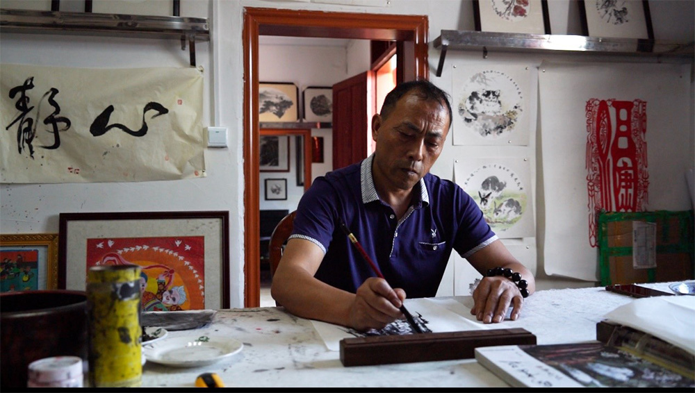 56歲的肖群,曾是鄰村一名屠夫,年輕時(shí)因?yàn)榕d趣曾學(xué)過(guò)繪畫。“那個(gè)時(shí)候畫畫賺不了錢,為了養(yǎng)家,我就在村里干起了屠宰。”肖群說(shuō)。盡管手握屠刀,心中對(duì)畫畫的熱愛(ài)卻沒(méi)有就此熄滅。隨著文化市場(chǎng)的活躍,在家人的鼓勵(lì)下,肖群重新拾起畫筆,求藝鉆研,苦練技藝,逐漸在當(dāng)?shù)匦∮忻麣狻?