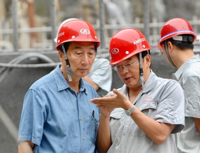 中國工程院院士、原三峽總公司總經理陸佑楣(左)和汪志林在溪洛渡建設現場討論。
