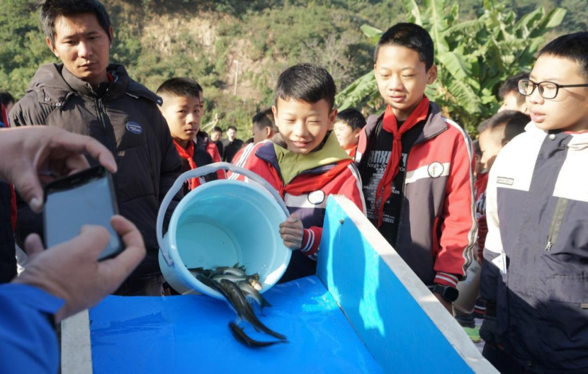 ▲ 松新鎮小學生向黑水河放流珍稀特有魚類