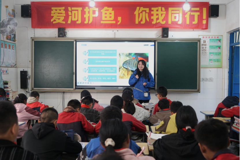 回到教室后,來自上海院的青年志愿者為孩子們講授了一堂生動的愛河護魚科普課。松新鎮小學班主任劉應歡說:“我們有很多孩子的家在附近山上,參與放流活動能讓他們親近河流,體驗保護珍稀魚類的過程,讓他們從小建立保護生態環境的認知。”