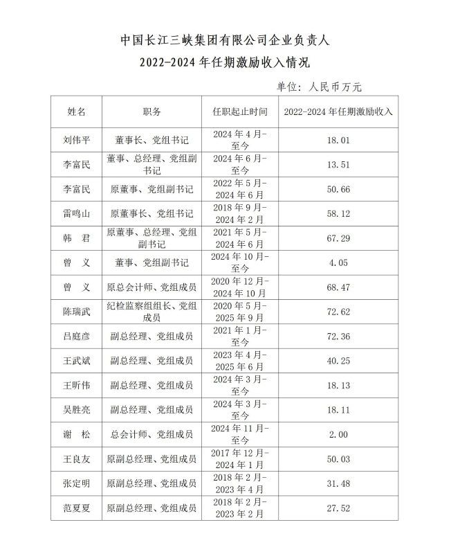 中國(guó)長(zhǎng)江三峽集團(tuán)有限公司企業(yè)負(fù)責(zé)人2022-2024年任期激勵(lì)收入情況
