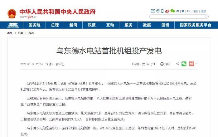 【中央人民政府網(wǎng)】烏東德水電站首批機(jī)組投產(chǎn)發(fā)電
