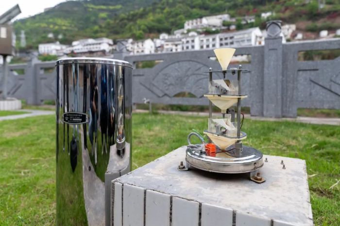 “至于降雨量的監測,我們采用的是翻斗式雨量計?!睆堄袼深I著記者登上站房屋頂,打開柱狀集雨桶,出現一個微型“閣樓”模樣的兩層裝置。